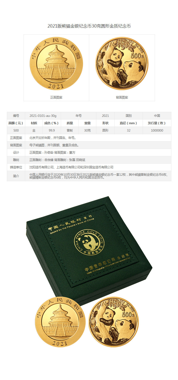 上海集藏 2021年熊猫纪念币30克金币带原装绿盒